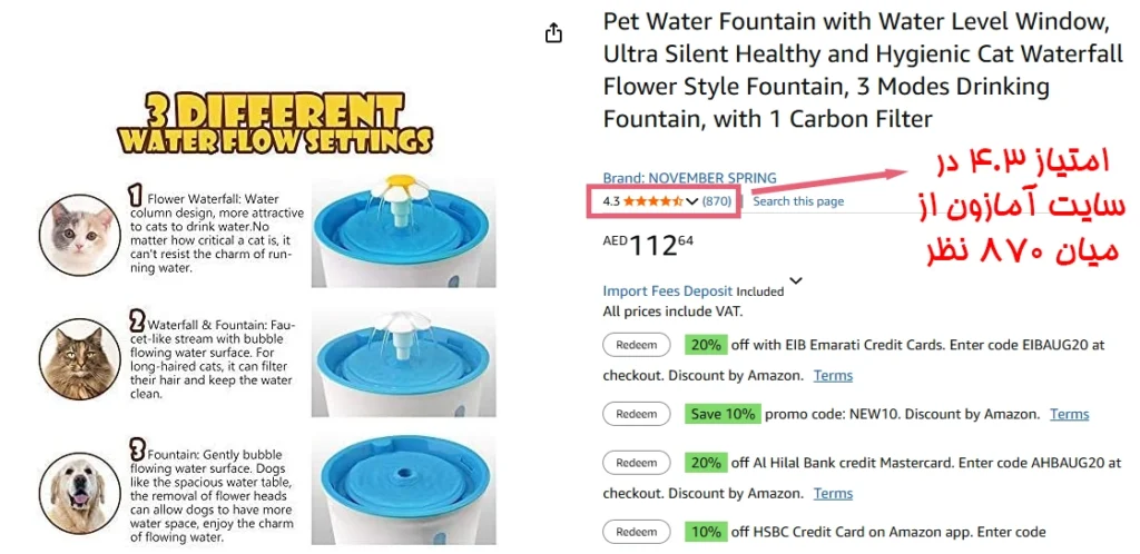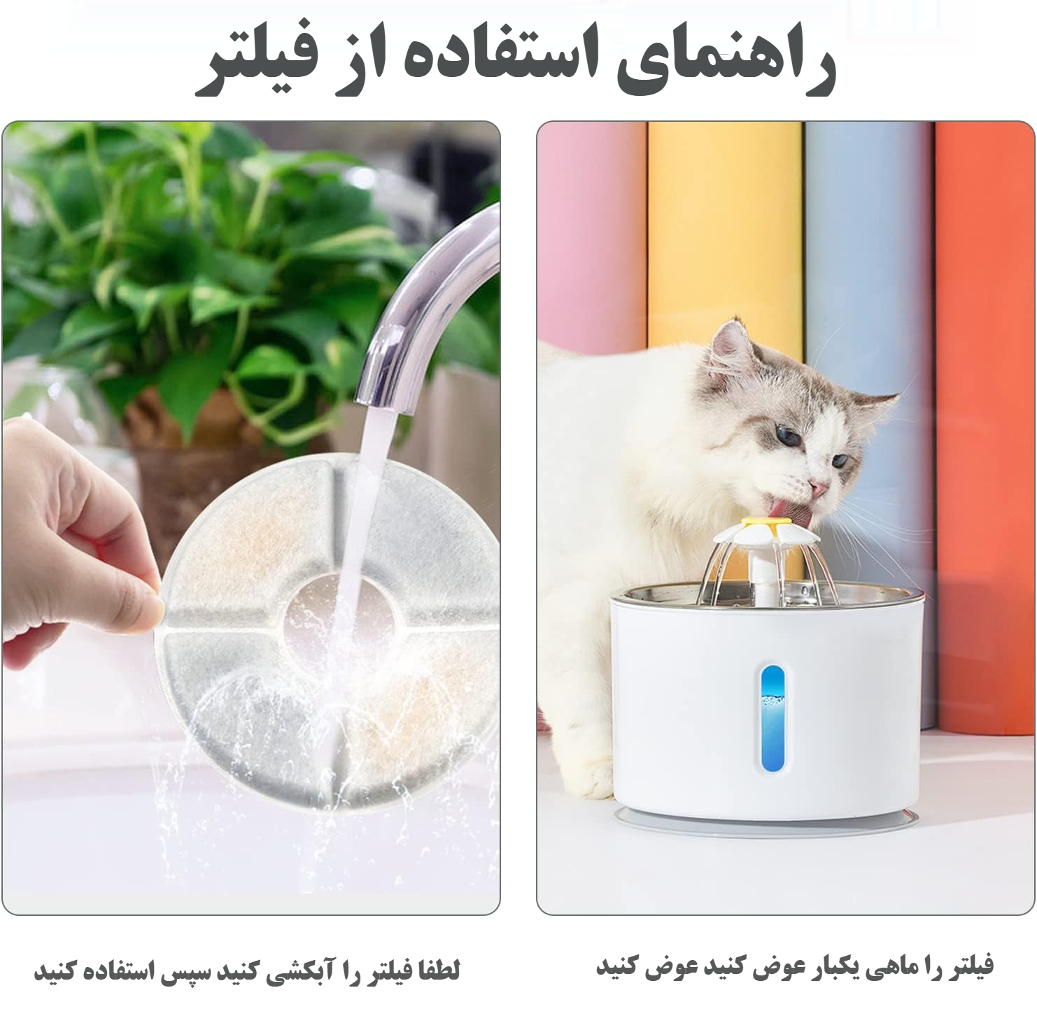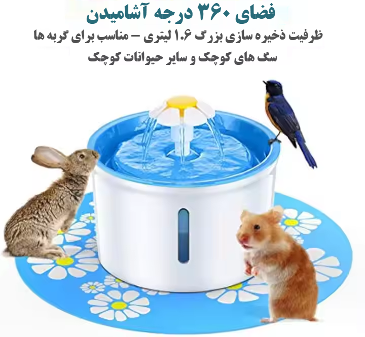 | ویژگی اضافه | صدای ملایم جریان آب برای جذب حیوان به نوشیدن بیشتر |
